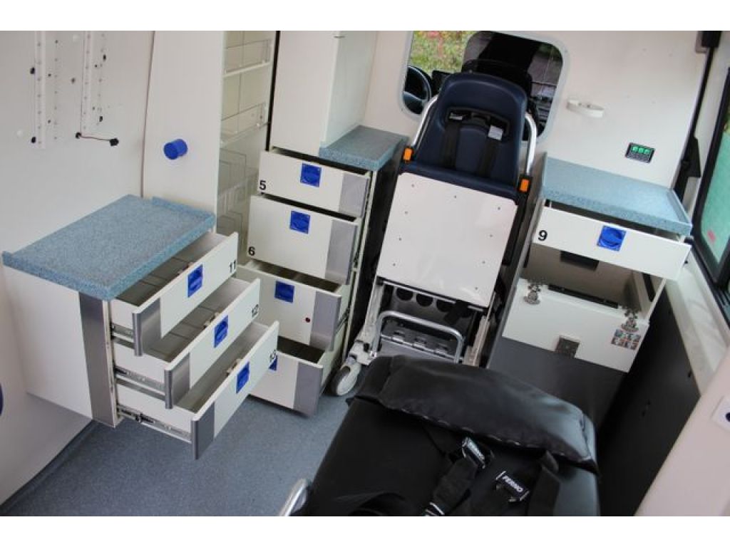 - inkl. Strobel Krankentragestuhl Sitzefläche wurde komplett neu bezogen (ohne STK) & passenden Auffahrschienen, die seitlich im Schrank hinter dem Fahrerhaus verstaut werden.