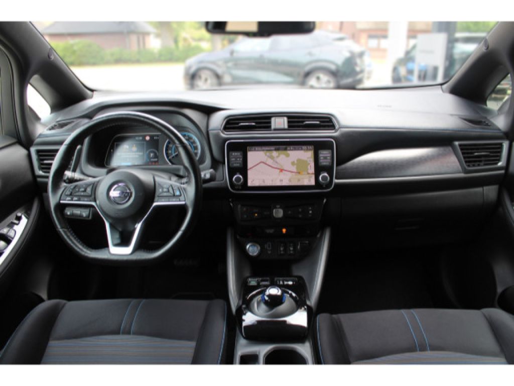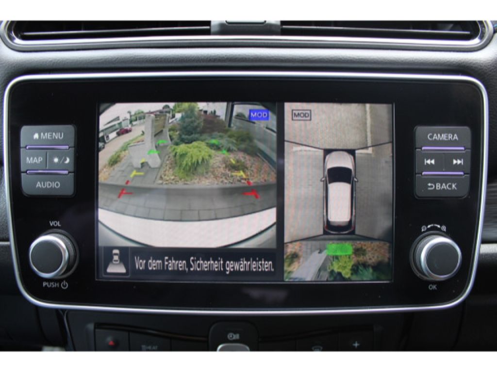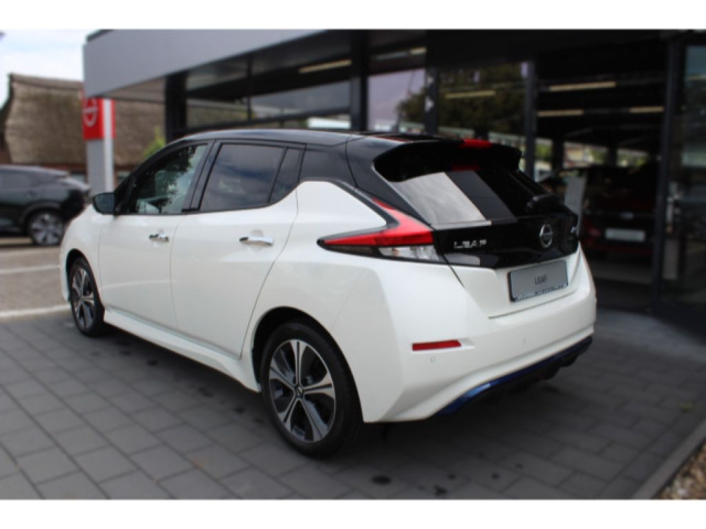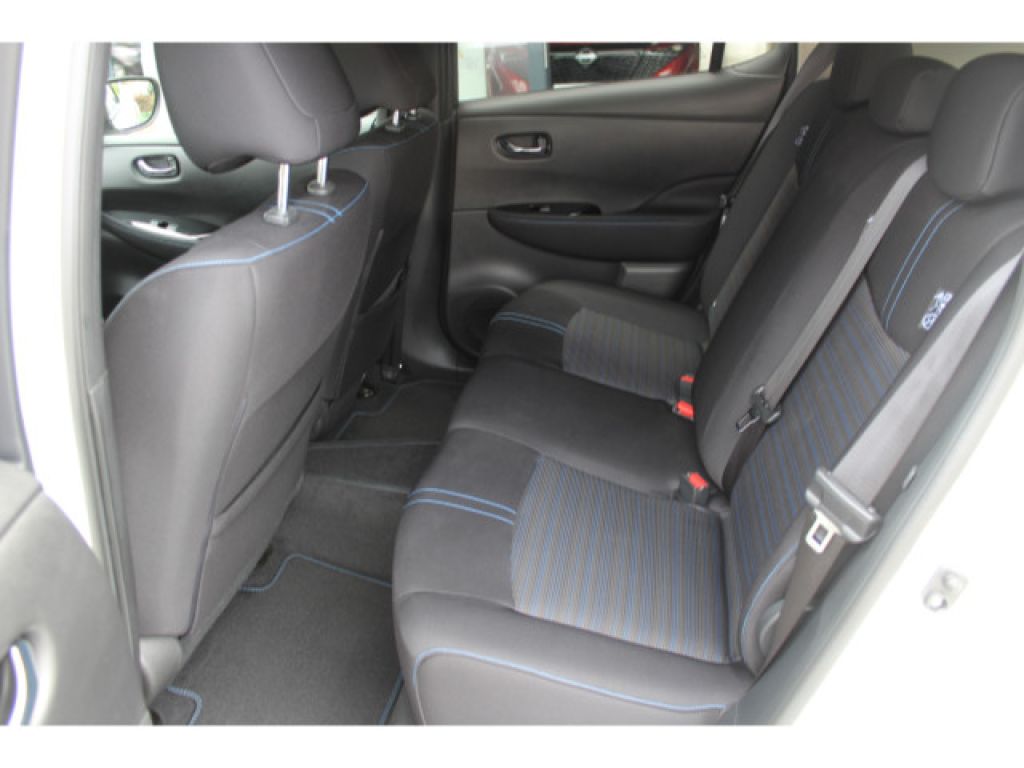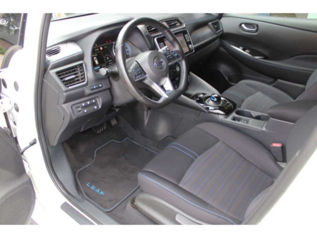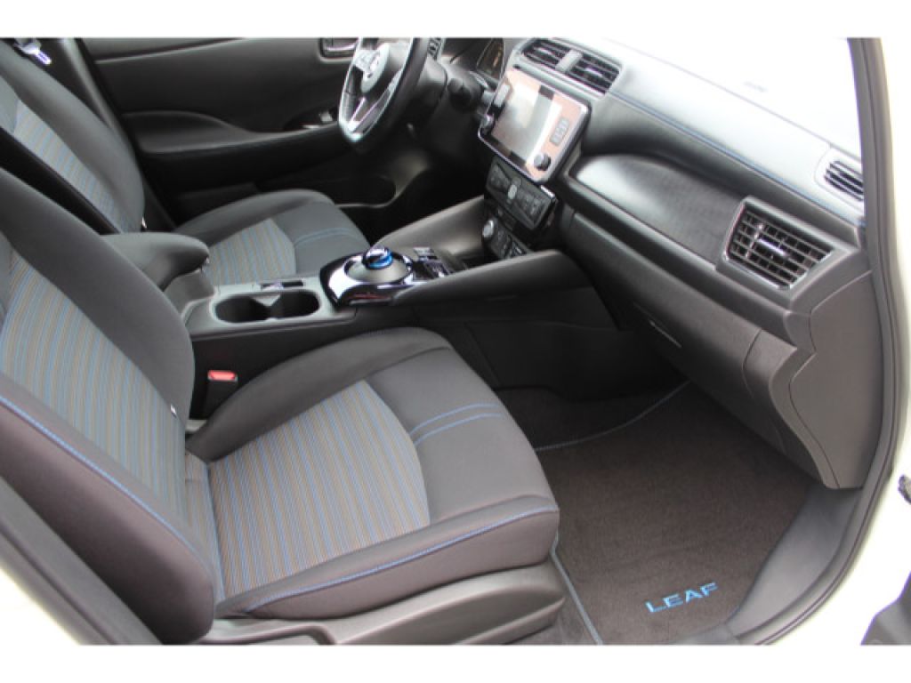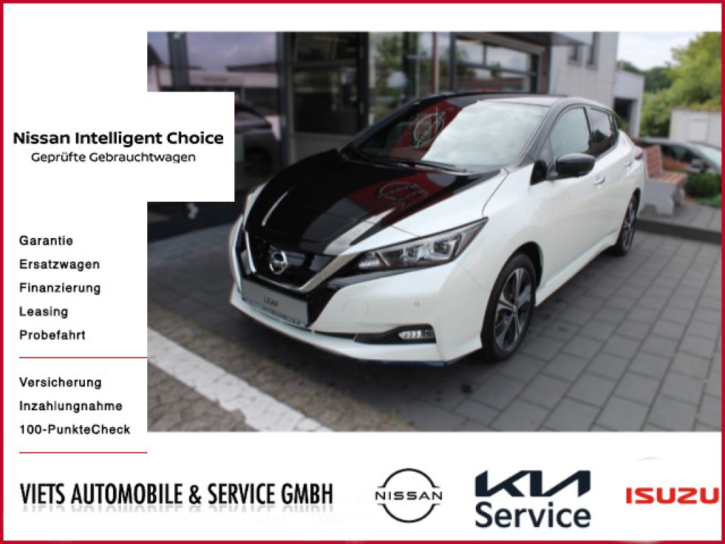 62 kWh Batterie, CHAdeMO-Schnellladeanschluss - Vehicle-to-Grid Ready - Gleichstrom - 50 kW (mit 100 kW kompatibel), Akustisches Annäherungssignal intermittierend - nach vorne abstrahlend bis 30 km/h, e-Pedal für das ?One-Pedal-Driving?, Elektromechanischer Verschluss für Ladekabel mit beleuchteter Ladekappe, EVSE-Ladekabel (Mode-2-Sicherheitssystem) mit Haushaltsstecker (bis 2,3 kW), Mode-3-Ladekabel Typ 2/Typ 2 (bis zu 7,4 kW), Typ-2-Ladeanschluss vorne - Wechselstrom (bis 6,6 kW), Wärmepumpe zur Senkung des Energieverbrauchs und Erhöhung der Reichweiten im realen Alltagsbetrieb, Außentemperaturanzeige, Apple CarPlay und Android Auto, Fensterheber elektrisch - hinten und vorne, Lenkradfernbedienung mit Freisprechanlage - Sprachsteuerung und intelligentem adaptiven Geschwindigkeits- und Abstands-Assistent, Lenkradfernbedienung mit ProPILOT, NissanConnect EV: Multimedia-System mit 8-Farbdisplay mit Touchscreen - Radio mit MP3-Wiedergabe - digitalem Radio (DAB) - Bluetooth Audio Streaming und Freisprechanlage - Sprachsteuerung - iPod Gateway - 6 Lautsprechern - individuell gestaltbarer Schnellzugriff auf Funktionen - 1 x USB-Port vorne - 2 x USB-Ports hinten - AUX-Schnittstelle - Sprachgesteuertes Navigationssystem inkl. RDS-TMC-Meldungen - EV-Telematiksystem mit Aufzeigen von Ladestationen auf der geplanten Route - umweltfreundliche Routenplanung - Anzeige der Reichweite und des Eco-Rankings - Energieinformationen - Fahreranalyse - NissanConnect EV App zur Steuerung u.a. der Klimaanlage und des Ladevorgangs, Rückfahrkamera in Farbe, Intelligenter AROUND VIEW MONITOR für 360 Rundumsicht mit Parksensoren vorne und hinten, elektrische Parkbremse, Zentralverriegelung mit Funkfernbedienung mit INTELLIGENT KEY mit Start-/Stopp-Knopf und Ladekappenverriegelung, Fahrer- und Beifahrersitz manuell verstellbar und Fahrersitz höhenverstellbar, Getränkehalter vorne - hinten - Mittelkonsole, Klimaautomatik inkl. Pollenfilter, Kofferraumabdeckung mit Beleuchtung und herausnehmbar, Lenkrad aus Leder, Lenksäule höhenverstellbar, Rückenlehne asymmetrisch (60:40) umklappbar, Steckdose 12 Volt vorne, Innenspiegel automatisch abblendbar, Blaue Akzentleiste an der Frontschürze, Scheiben verdunkelt ab der B-Säule, 17-Leichtmetallfelgen mit Bereifung 215/50 R17, B-Säule in Schwarz glänzend lackiert, Außenspiegel in Wagenfarbe lackiert - elektrisch anklappbar - elektrisch einstellbar - mit integriertem Blinklicht, Dachantenne, Frontscheibe aus Verbundglas und UV-absorbierend, LED-Scheinwerfer (mit manueller Höhenregulierung), LED-Nebelscheinwerfer mit Kurvenlichtfunktion, LED-Rückleuchten, LED-Tagfahrlicht, Nebelschlussleuchte, Türaußengriffe in Chrom-Optik, vorne und hinten Scheibenwischer mit Intervallschaltung und Regensensor vorne, Winterpaket: Sitzheizung vorne und hinten - beheizbares Lenkrad - beheizbare Außenspiegel, Antiblockiersystem (ABS) mit elektronischer Bremskraftverteilung (EBD) und NISSAN Brems-Assistent, Berganfahr-Assistent, Dreipunkt-Sicherheitsgurte