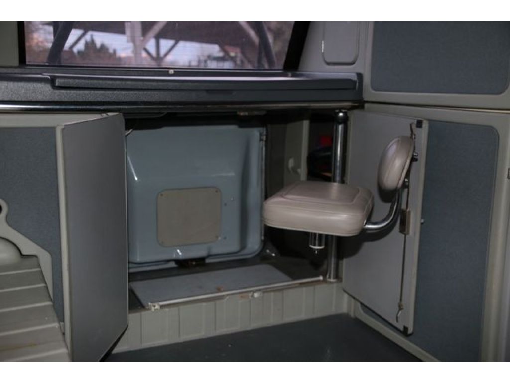 Die tolle Optik wird unterstrichen durch das Sportpaket mit den orig. Alufelgen und dem orig. Lederlenkrad. Ein Fahrradträger ist ebenso an Bord wie eine Anhängerkupplung (1.910 kg gebremste Anhängelast). Für den Komfort ist Vieles verbaut, was in den 90-er Jahren nicht selbstverständlich und serienmäßig war, wie z.B. Nebelscheinwerfer, Zentralverriegelung, Servolenkung, elektr. Fensterheber, elektr. Außenspiegel, Velours-Sitze mit Armlehnen, 2x Glasdächer (vorne und hinten), zeitgenössischer Cassetten-Radio von Blaupunkt. Im Heck ist ein herausschwenkbarer Stuhl (somit kann der Schrank im Heck z.B. als Schreibtisch verwendet werden) sowie eine Spüle verbaut. Auf der linken Seite finden sich die Naßzelle mit Waschbecken und herausklappbarer Duschwanne sowie der Bestackkasten und Kühlschrank sowie Staufächer. Das Dach hinten läßt sich elektrisch ausfahren, um Stehhöhe zu erreichen. Die hinteren Einzelsitze lassen sich verschieben und Flachlegen zum Schlafen. Eine weitere Schlafmöglichkeit bietet das ausrollbare, hängende Bett. Das Auto ist also je nach Belieben ein Van, ein Camingbus oder ein Büromobil.