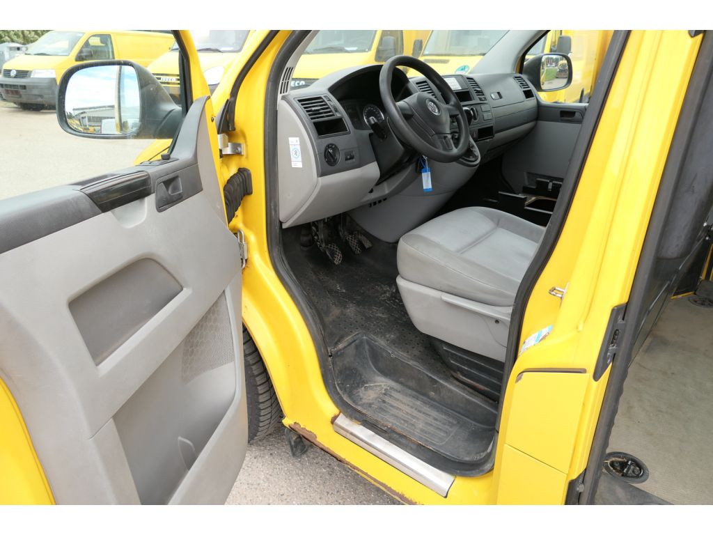 Dieser Transporter ist in der Farbe Ginstergelb lackiert und besitzt eine umfangreiche Ausstattung, darunter Parksensoren hinten, zwei Schiebetüren (links und rechts) sowie eine hohe Laderaumtrennwand mit Fenster. Der Innenraum ist mit robusten Sitzpolstern ausgestattet, und sowohl Fahrer- als auch Beifahrersitz sind verstellbar. Weitere Eigenschaften sind ein Bremsassistent und ein Multifunktionsdisplay.